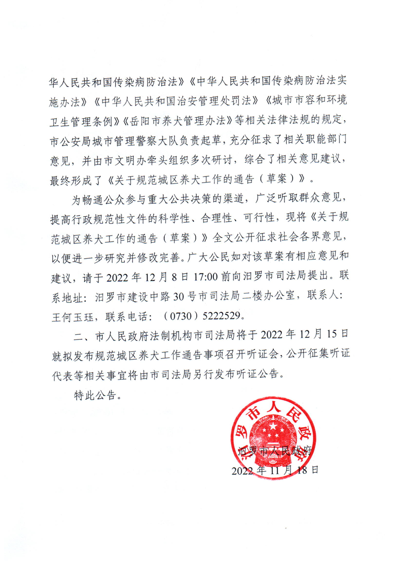 为进一步规范城区养犬行为,加强和改进养犬管理工作,维护公共秩序和环境卫生,保障人民群众人身安全与健康,切实做好我市文明城市创建工作,根据《中华人民共和国动物防疫法》《中华人民共和国传染病防治法》《中华人民共和国传染病防治法实施办法》《中华人民共和国治安管理处罚法》《城市市容和环境卫生管理条例》《岳阳市养犬管理办法》等有关法律法规的规定,市人民政府决定对全市城区养犬进行规范,并在城区开展流浪犬专项治理行动。现将有关事项通告如下: